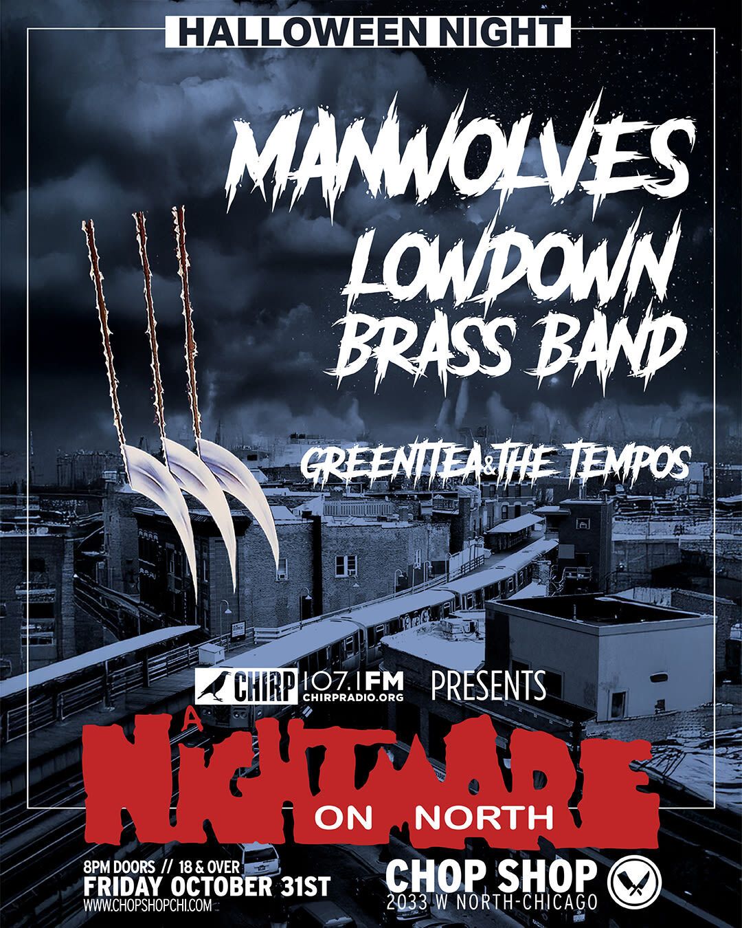Come boogie down at Chop Shop w/ Manwolves + Lowdown Brass Band + GreenTTea & The Tempos for Nightmare on North! Get Freaky. Get Funky.