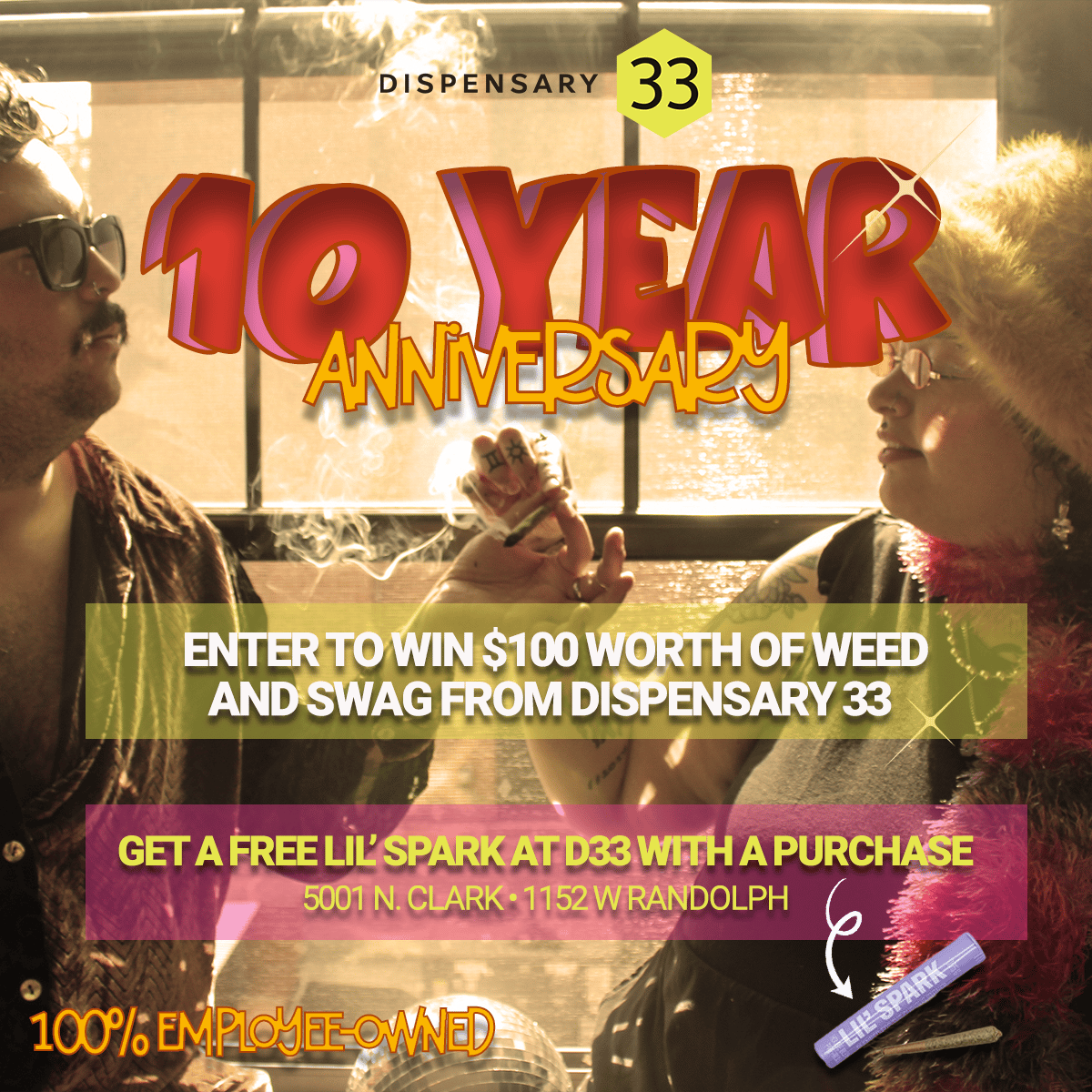 Plus—enter to win a $100 Dispensary 33 gift card and an exclusive swag bundle featuring a custom tote and premium smoke essentials. Cheers to 10 years of lighting it up with us. ✨