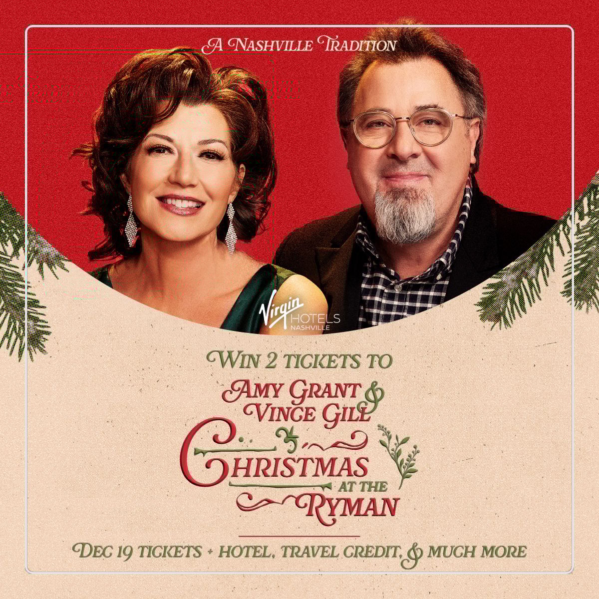 Enter to win two tickets to Amy Grant and Vince Gill’s December 19 Christmas at the Ryman performance, along with hotel accommodations and travel credit. The annual residency fills the historic auditorium with holiday favorites performed by two artists who have shaped the season’s soundtrack for many years. Your prize also includes a When I Think Of Christmas merch bundle.